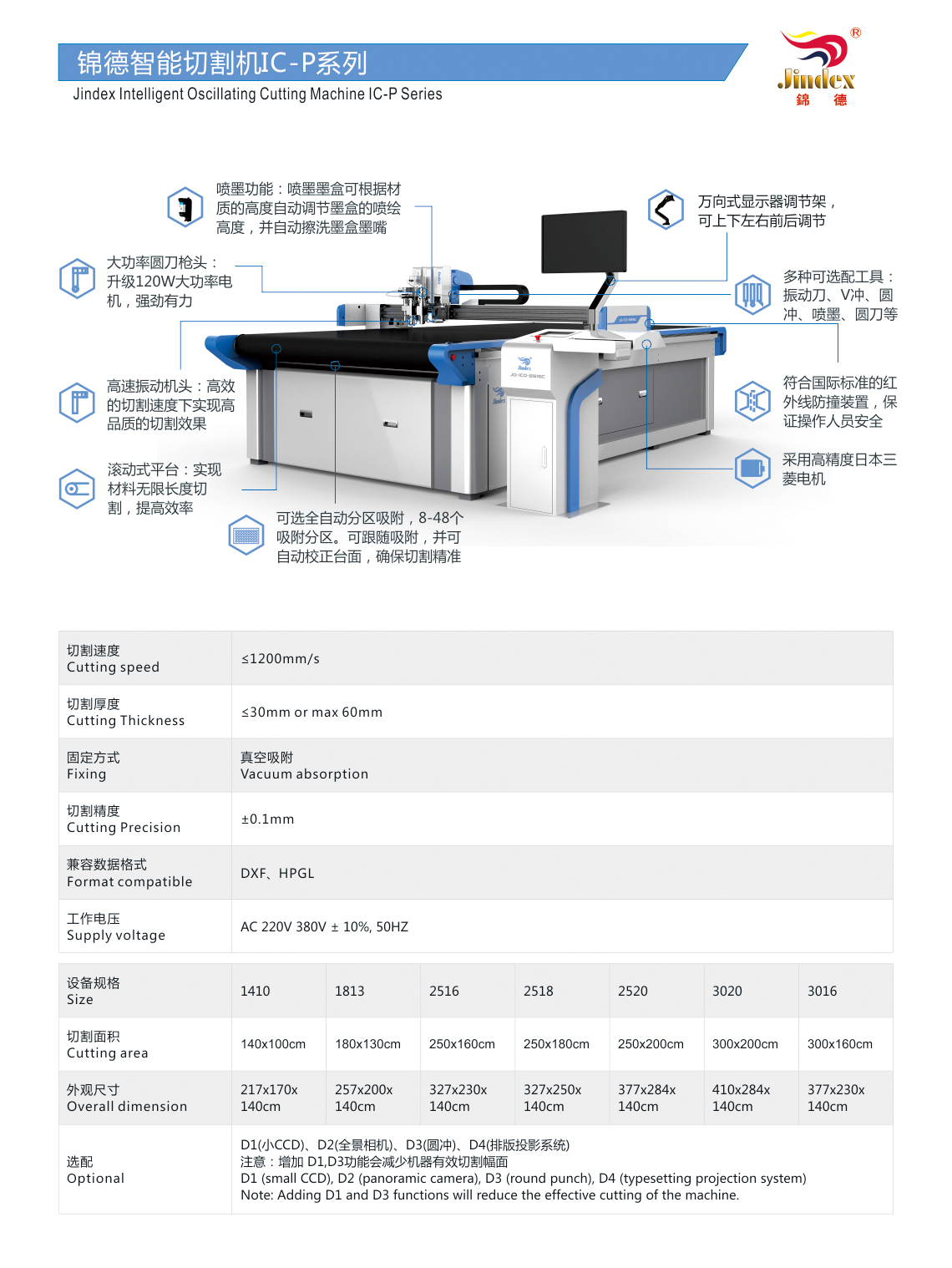 噴墨振動(dòng)刀的型號(hào)JD-ICO2-2518S,JD-ICO4-2518S,JD-ICO2-2516S,JD-ICO4-2516S, 2代表2個(gè)噴頭,4代表4個(gè)噴頭,S代表標(biāo)準(zhǔn)機(jī)器。就是2個(gè)噴頭+振動(dòng)刀或者一把圓刀(2選一)+沖剪口功能