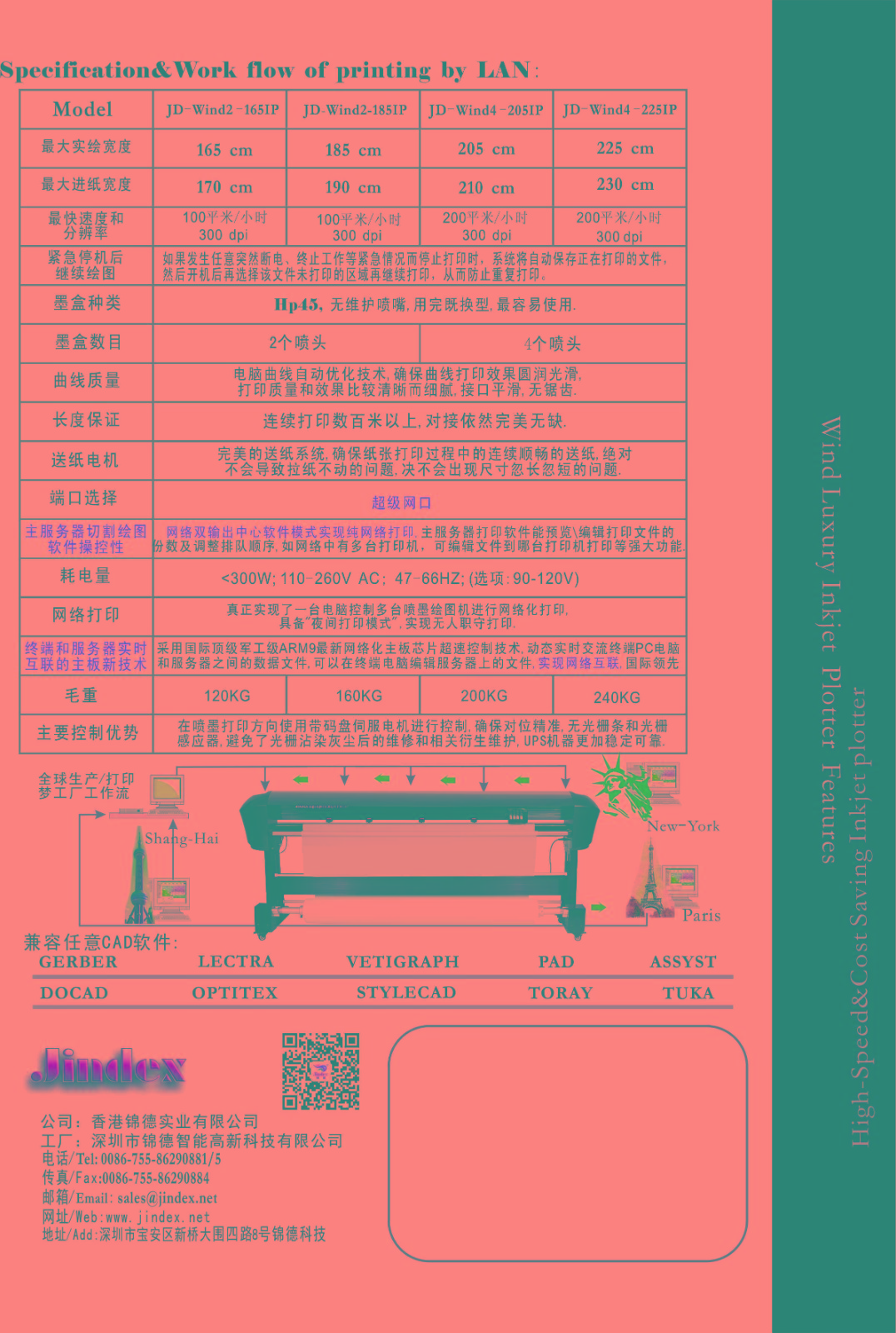 高速噴墨繪圖儀打樣效果清晰,性能穩(wěn)定,精確度達(dá)到國(guó)際標(biāo)準(zhǔn); 標(biāo)準(zhǔn)機(jī)型雙噴墨,可升級(jí)4噴(比雙噴速度快1.5倍)